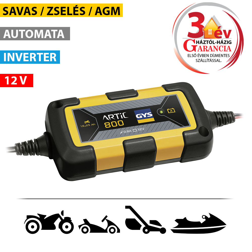 - 12 V-os (savas-ólom) 1.6 - 25 Ah kapacitású akkumulátorok töltésére lett kifejlesztve, egyben a töltöttségi állapot fenntartását is lehetővé teszi 80 Ah-ig.