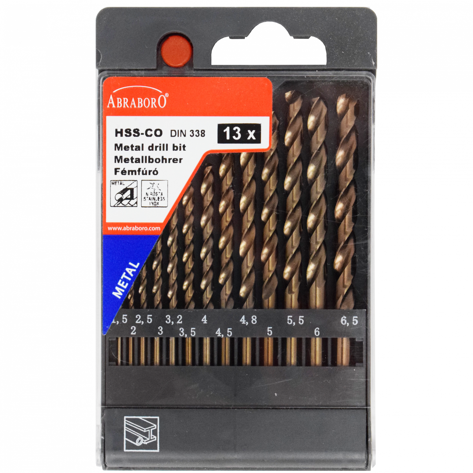 Abraboro HSS-Co 13 részes fémfúró készlet, műanyag dobozban